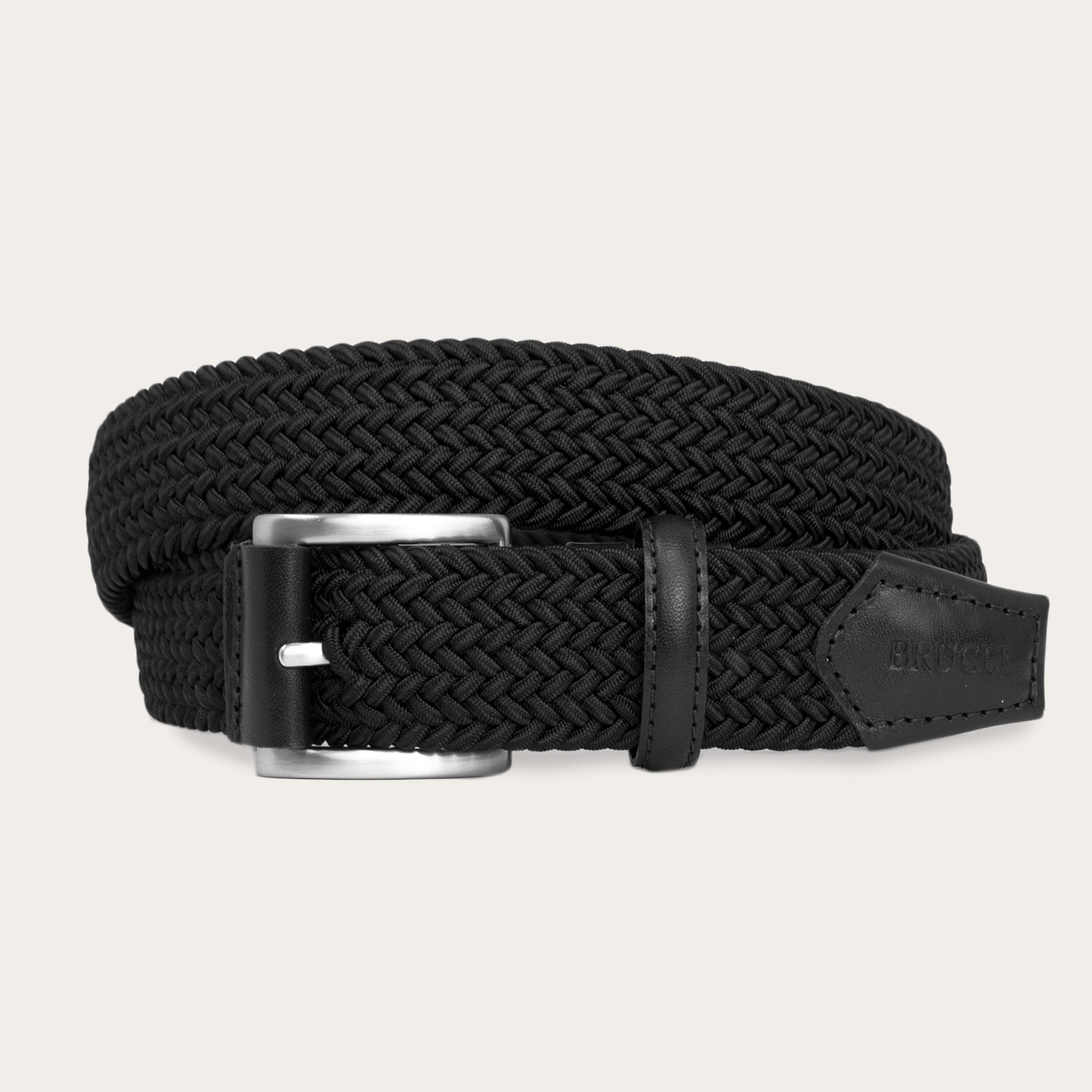 Cintura in elastico intrecciato nero impreziosita da una fibbia in ottone ricoperta in morbida pelle bovina in tinta. Da indossare in ogni stagione.