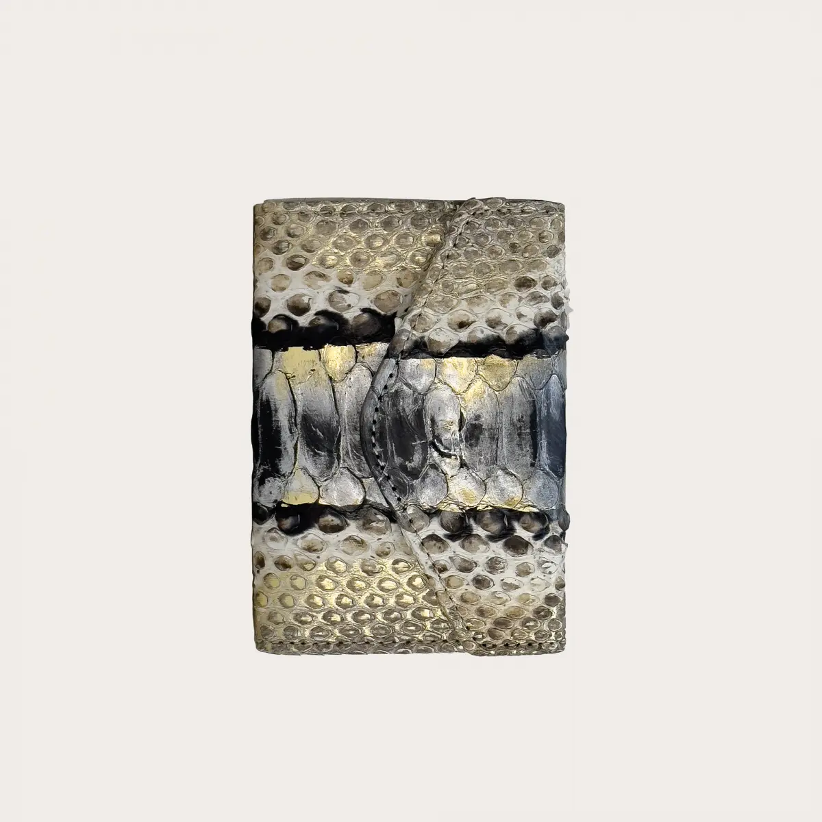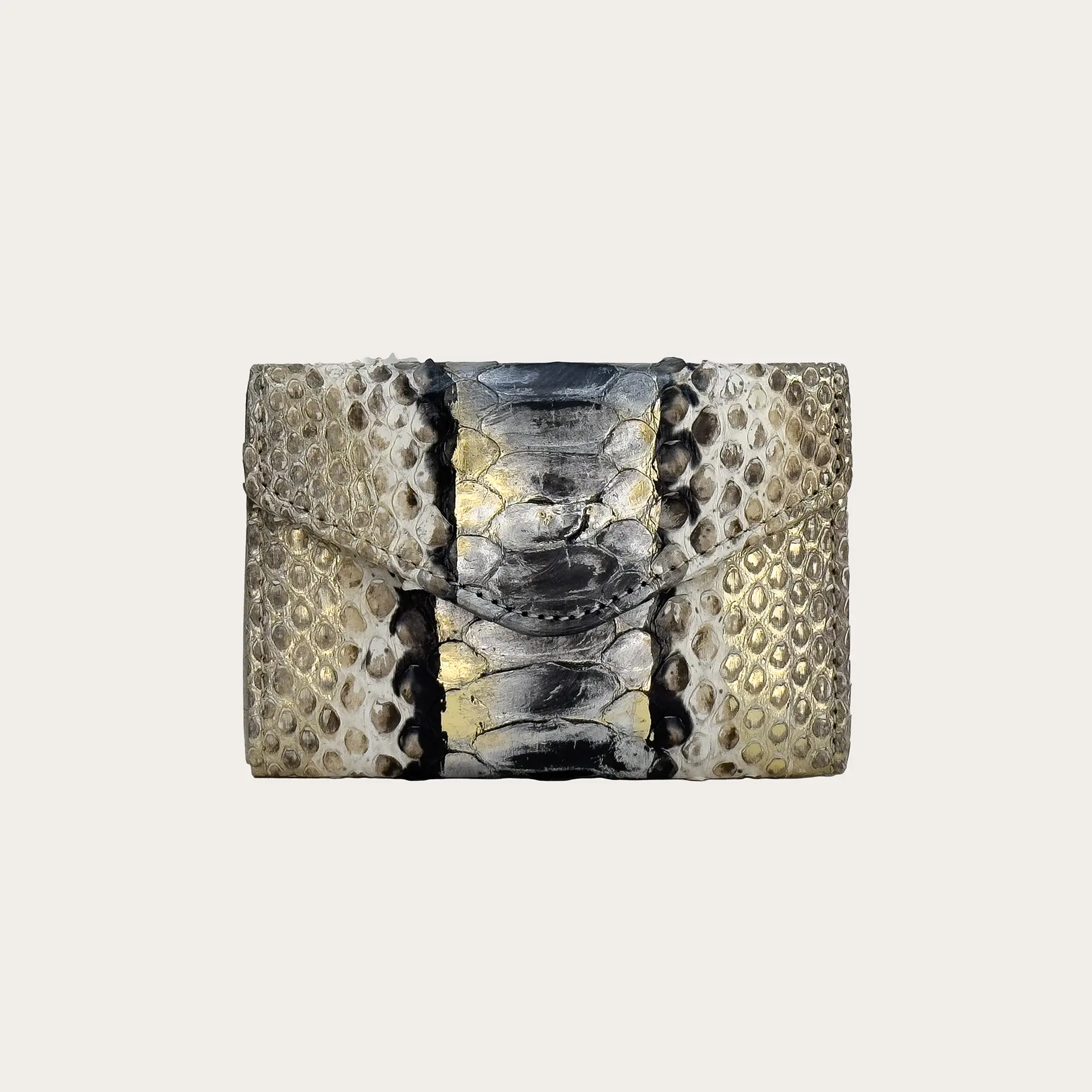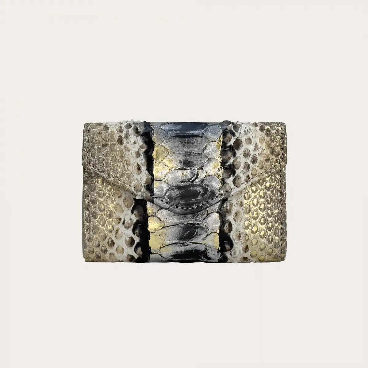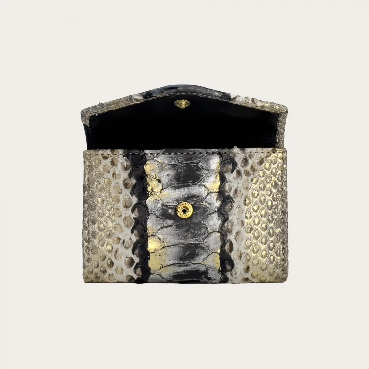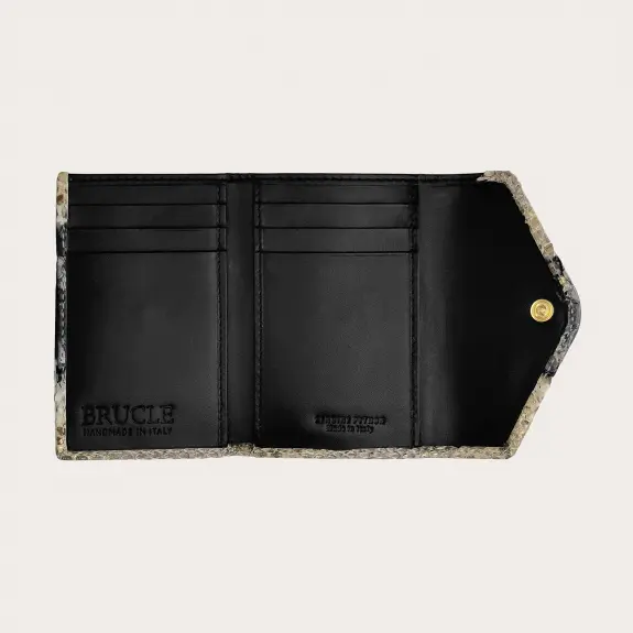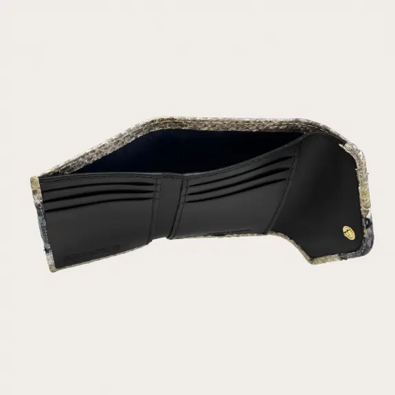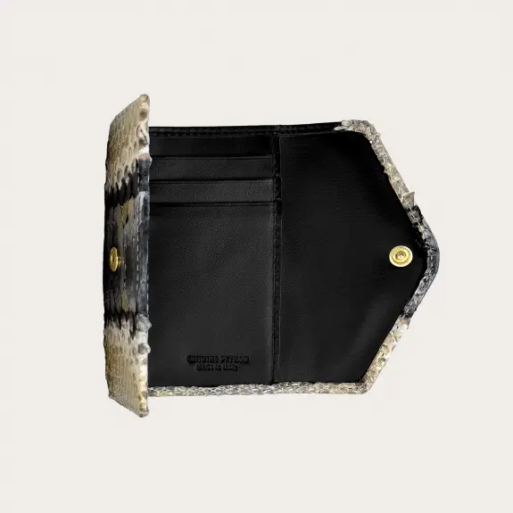 Portafoglio compatto donna in vera pelle di pitone, caratterizzato da una chiusura con bottone nascosto e una forma che valorizza la bellezza unica di questa originale pelle esotica dall'effetto metallizzato.