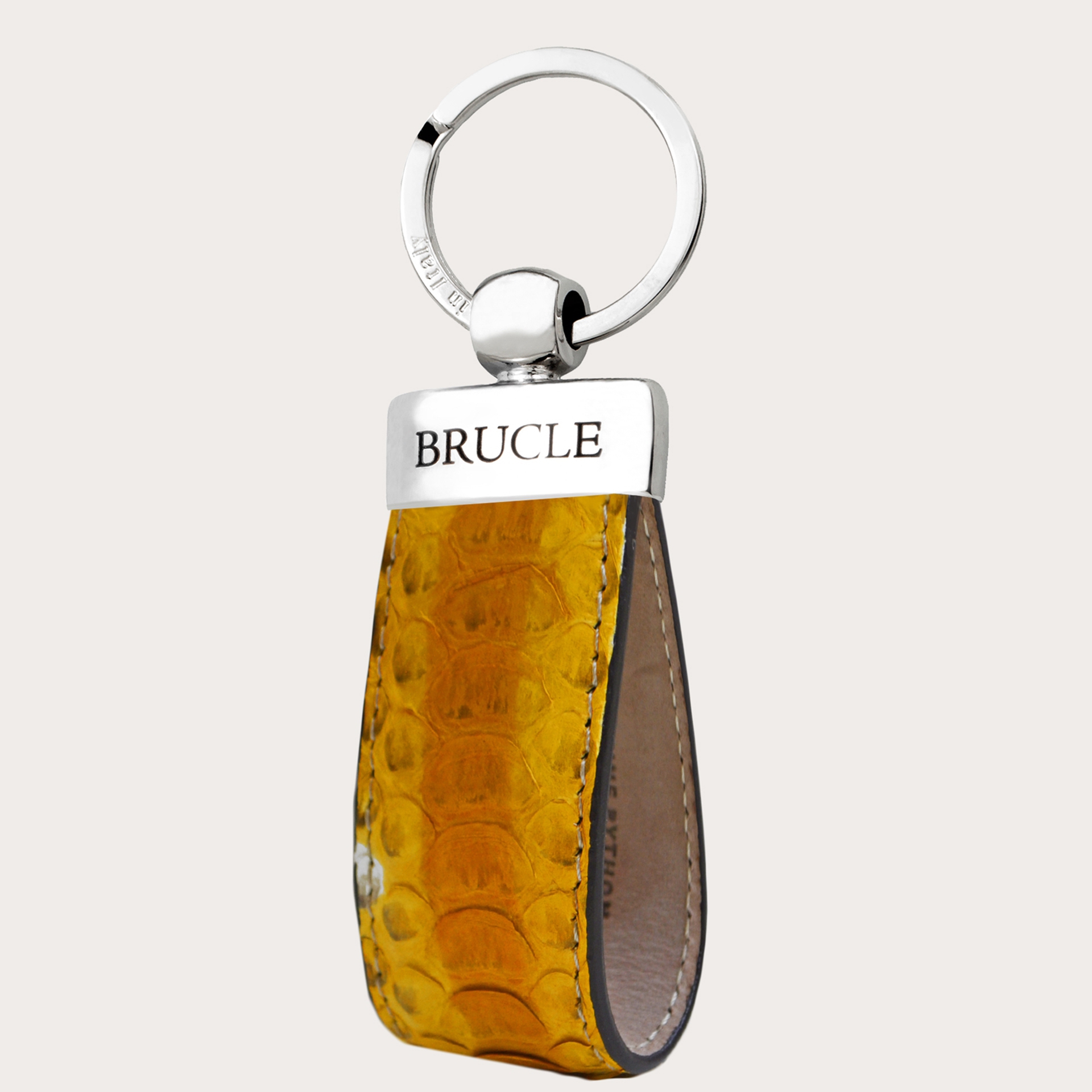 Scopri il fascino indiscusso del portachiavi in vero pitone dipinto giallo BRUCLE, una fusione perfetta tra artigianalità e stile. Realizzato a mano in Italia, questo accessorio riflette l'essenza dell'alta qualità 'Made in Italy'. La vivida tonalità di giallo, abbinata alla texture esclusiva del pitone, rende ogni portachiavi un pezzo unico, distintivo e inimitabile.