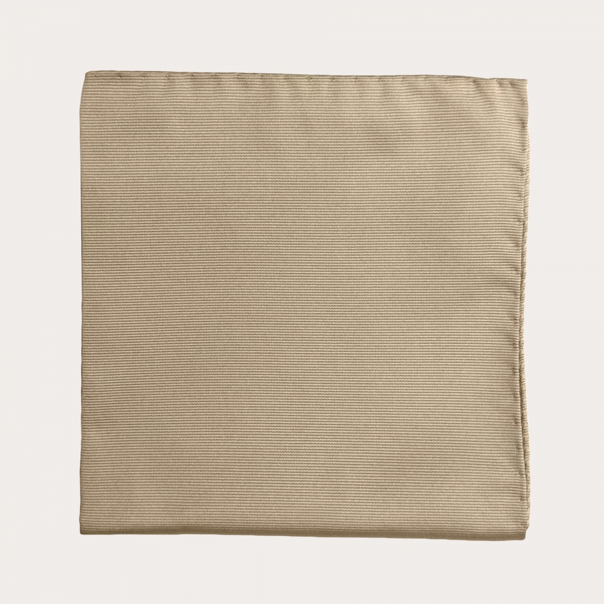 Aggiungi un tocco di raffinatezza al tuo stile con questo fazzoletto da taschino in seta color champagne, interamente realizzato a mano con maestria artigianale. Ogni dettaglio riflette l'alta qualità della seta tessuta a Como, famosa per la sua straordinaria lucentezza e morbidezza.