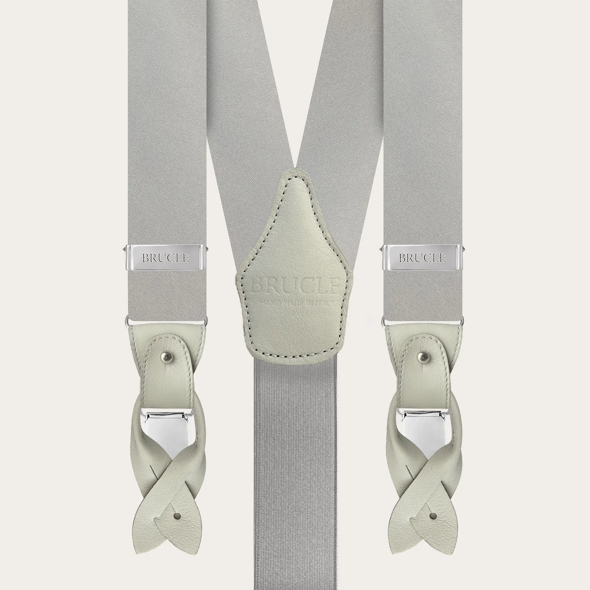 Stile: Bretella a Y con gambe frontali regolabili in seta e gamba posteriore in elastico che garantisce una perfetta vestibilità Bretelle Doppio uso: si possono indossare con le clips oppure con i bottoni e i baffi Composizione: 100% seta jacquard - asta posteriore elastica Poliestere 85% Elastodiene 15% - baffi e davantini in vera pelle bovina sfumata e tamponata a mano Larghezza: 35 mm Lunghezza Regolabile: 120 cm Colore: grigio; parti in pelle: grigio sfumato a mano Colore clip: argento 100% progettata e realizzata in Italia