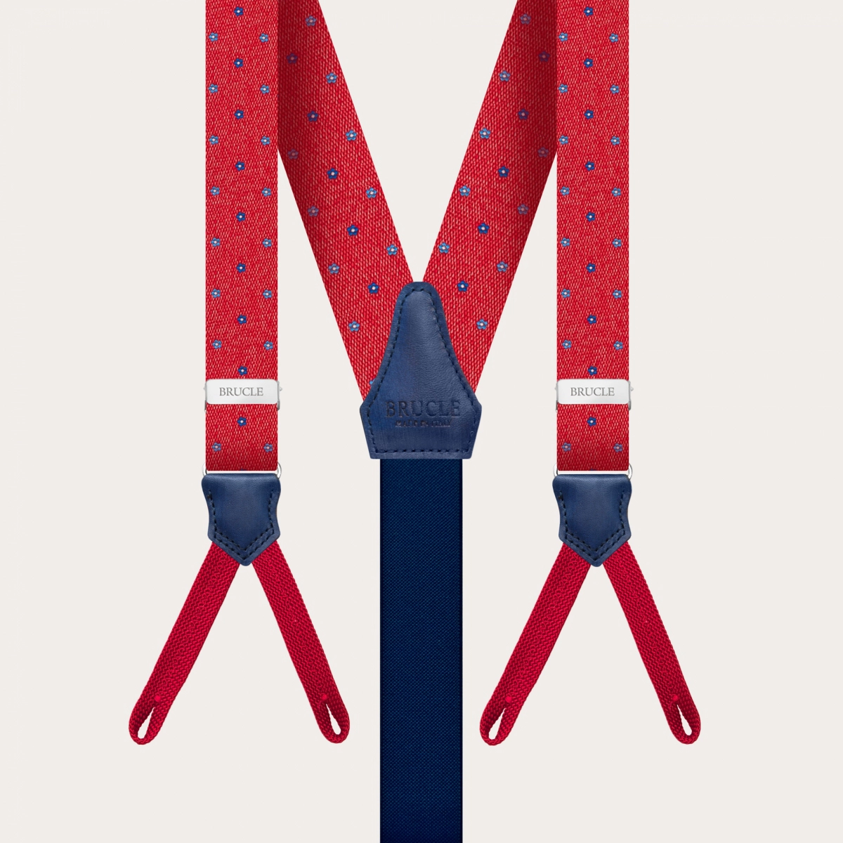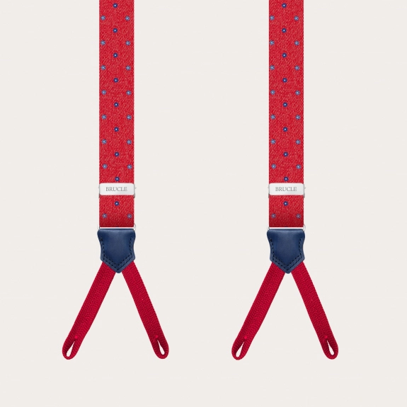 Stile: Bretelle a Y Singolo uso: solo con i bottoni Composizione: 100% seta - asta posteriore elastica Poliestere 85% Elastodiene 15% - davantini in vera pelle bovina tinta a mano, asole in tessuto Larghezza: 25 mm Lunghezza: 120 cm Colore: rosso Baffi e finiture in pelle primo fiore colorate a mano 100% progettata e realizzata in Italia
