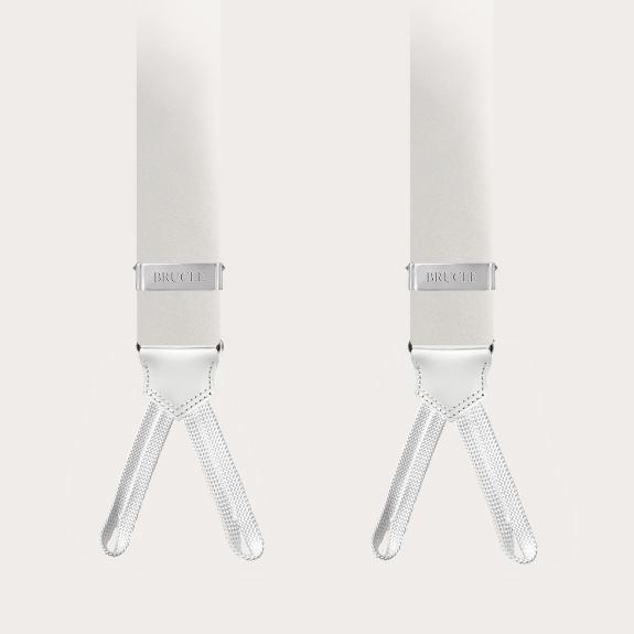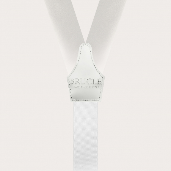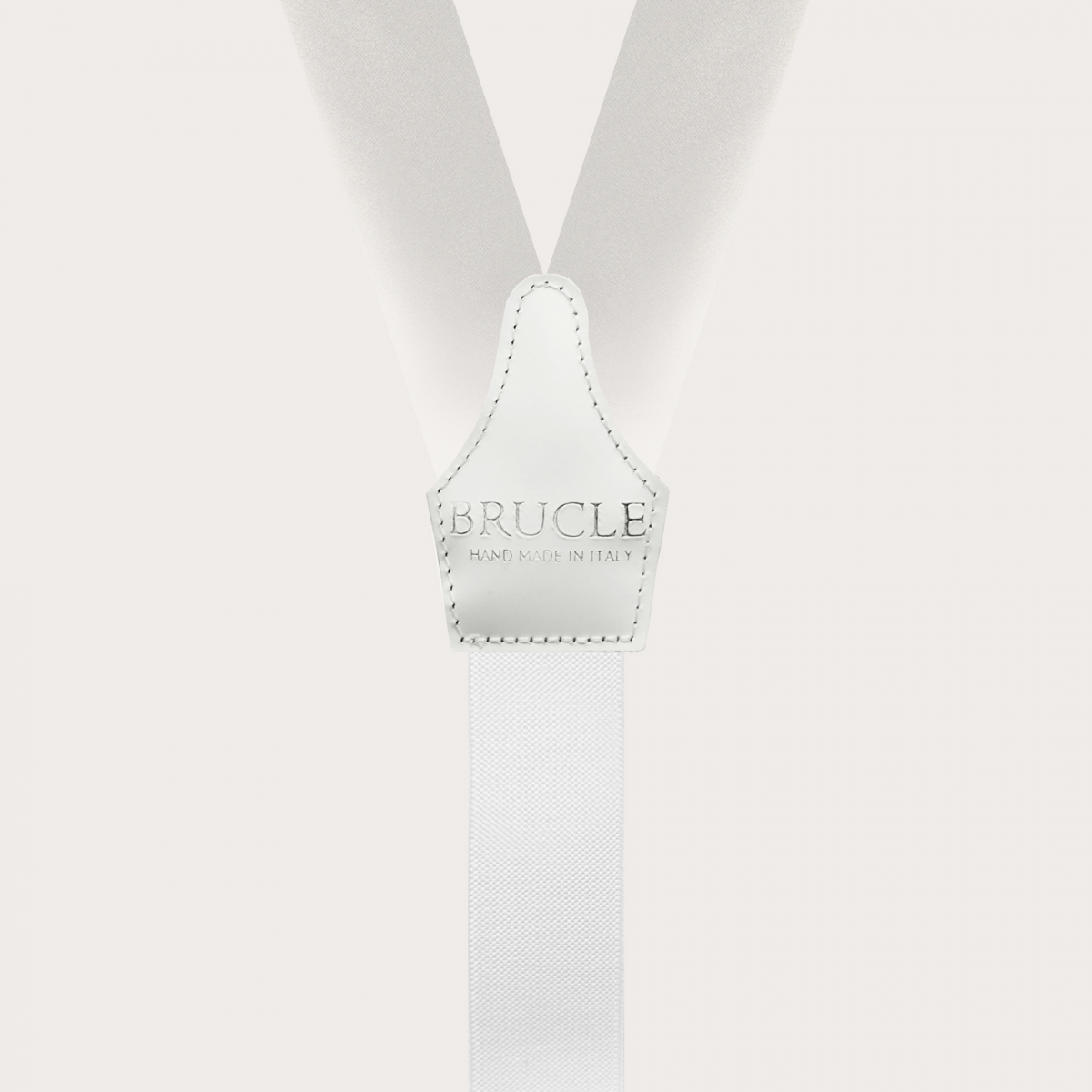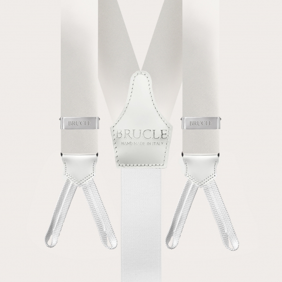 Le nostre bretelle per bottoni con asole, raso bianco, sono indicate per occasioni formali in cui volete sfoggiare il vostro stile e la vostra eleganza. Un colore classico e senza tempo, complimentato dall'unione con le parti in pelle in concia vegetale. 100% Made in Italy, sono prodotte con cura e passione dai nostri migliori artigiani con sete e pelli di alta qualità.