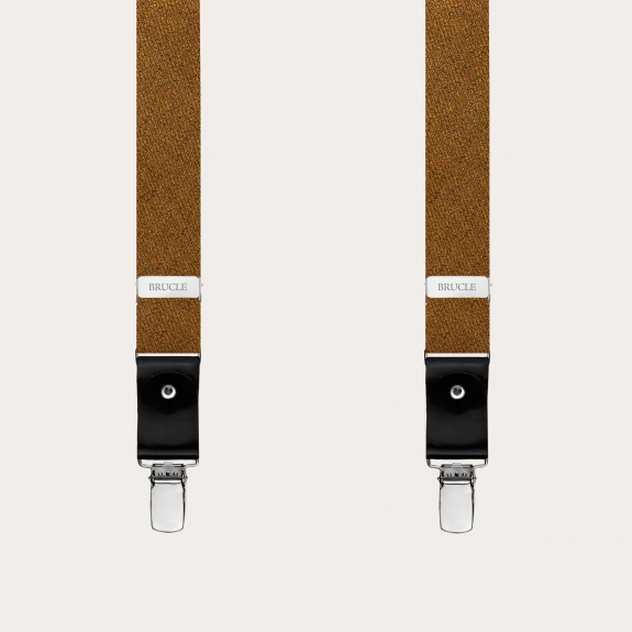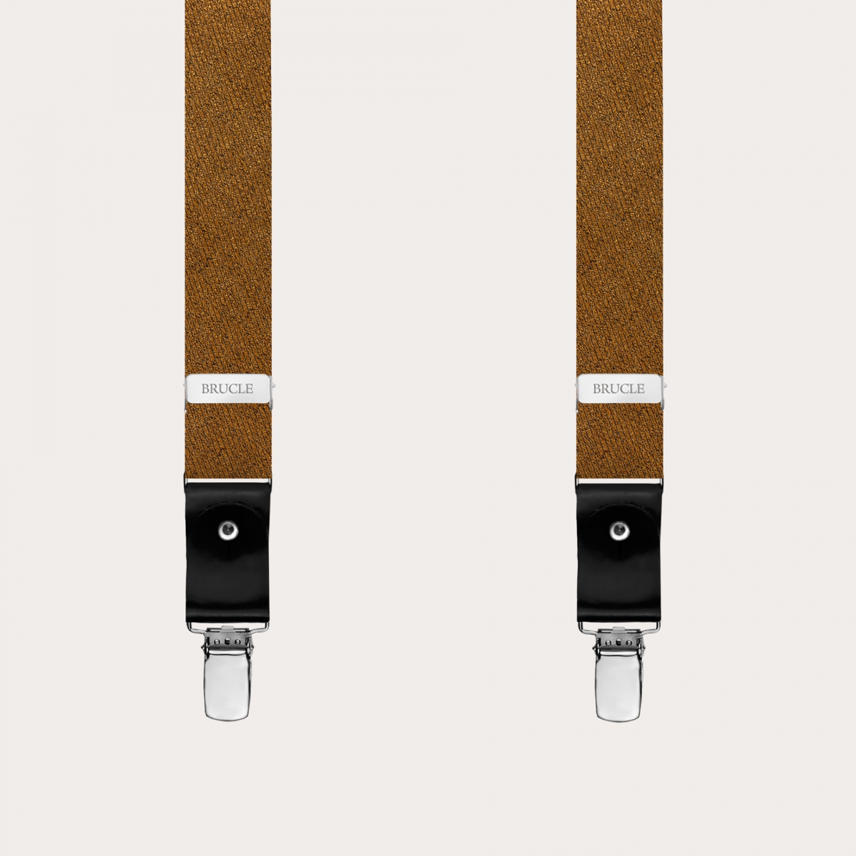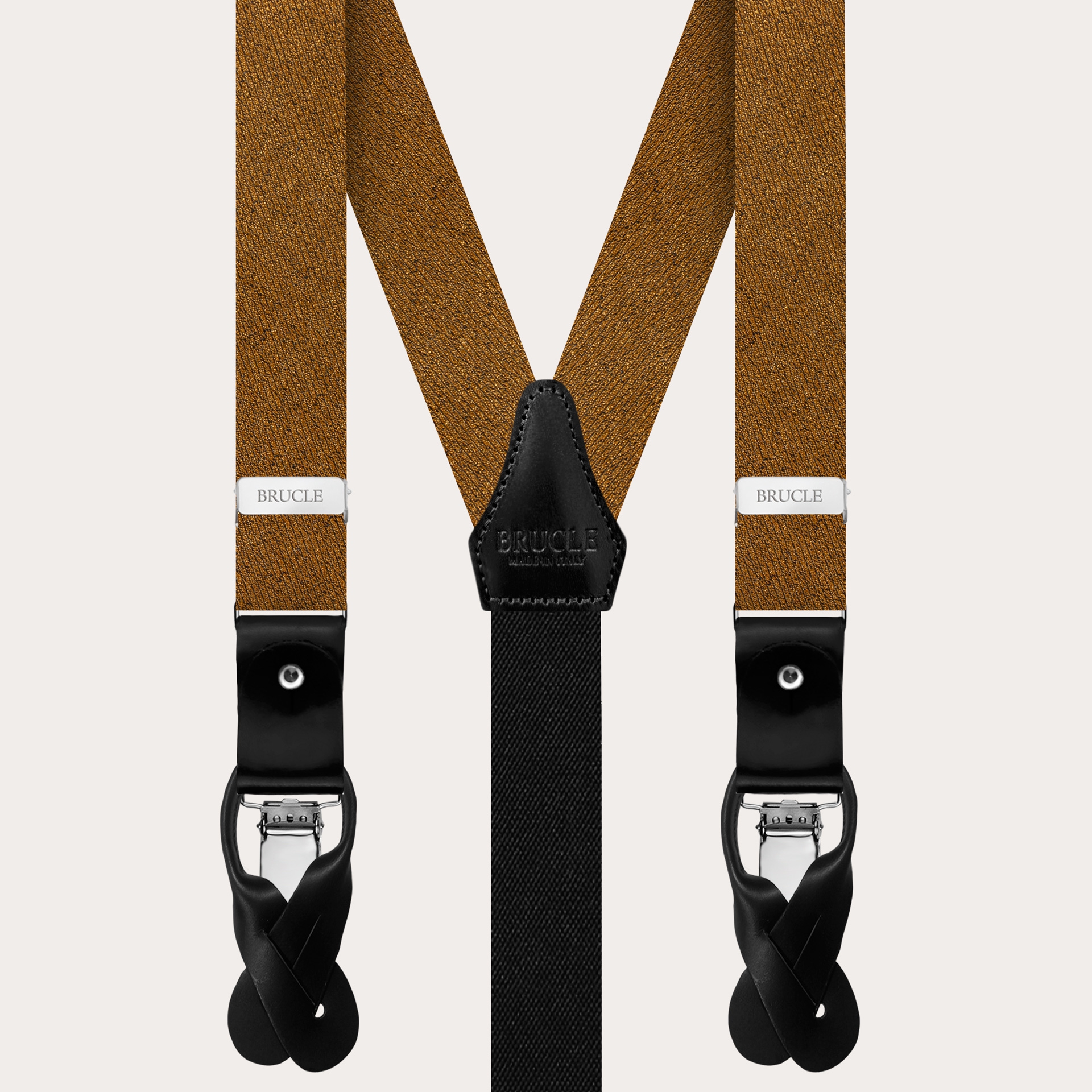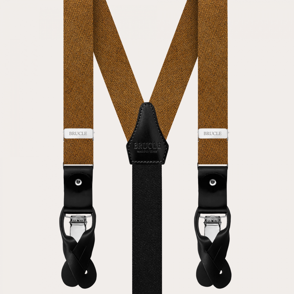 Bretelle uomo in seta color champagne, arricchite da clip e parti metalliche in elegante oro: una sinfonia di toni raffinati che esaltano la pregiata trama jacquard della seta.