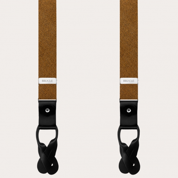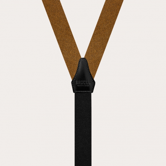 Realizzate artigianalmente in Italia con materiali di altissima qualità, le bretelle presentano finiture metalliche dorate e dettagli in pregiata pelle bovina marrone scuro a contrasto.