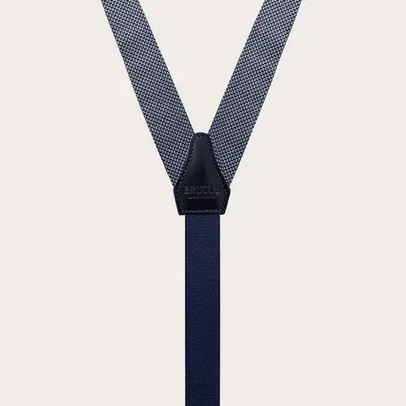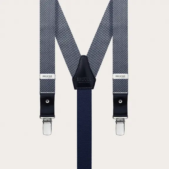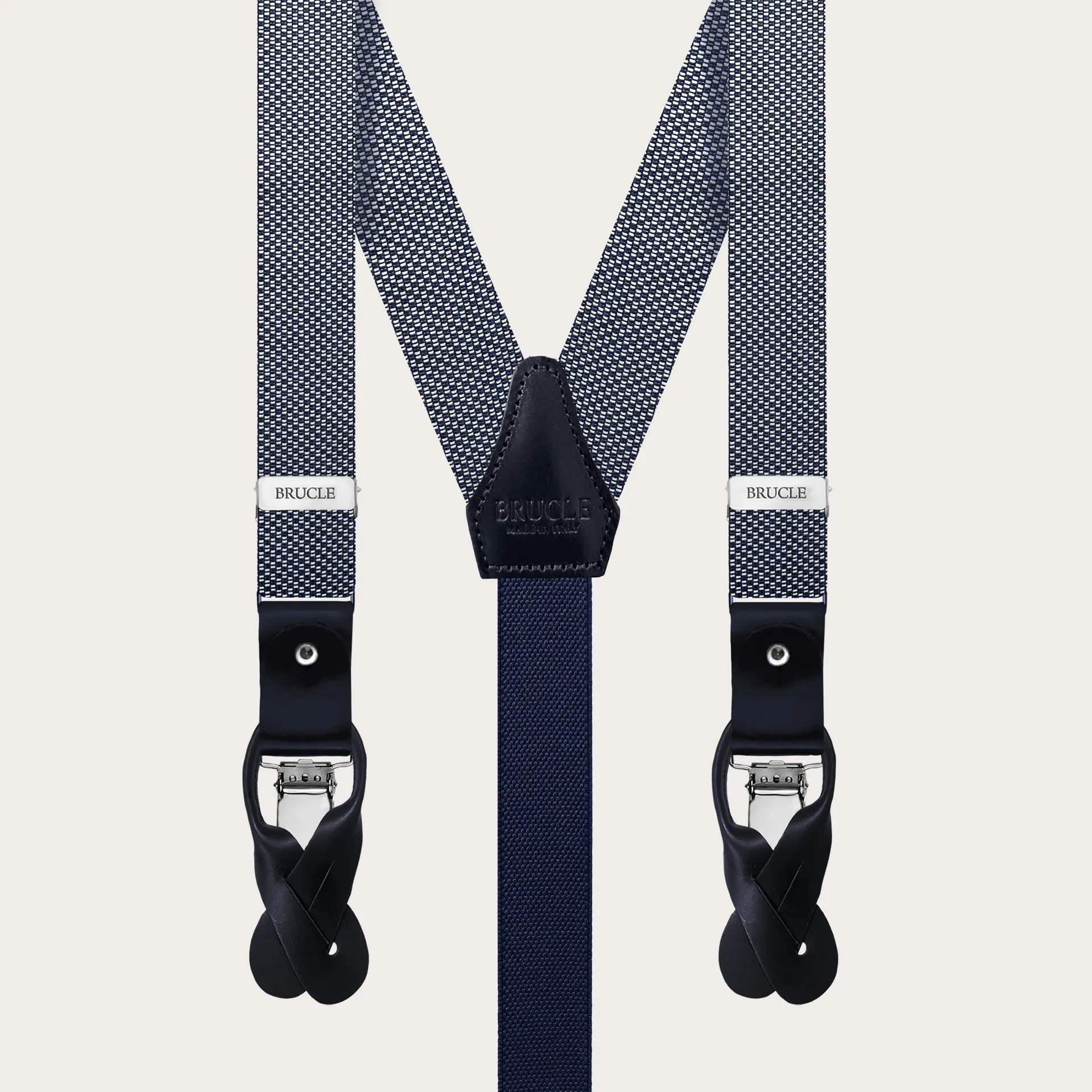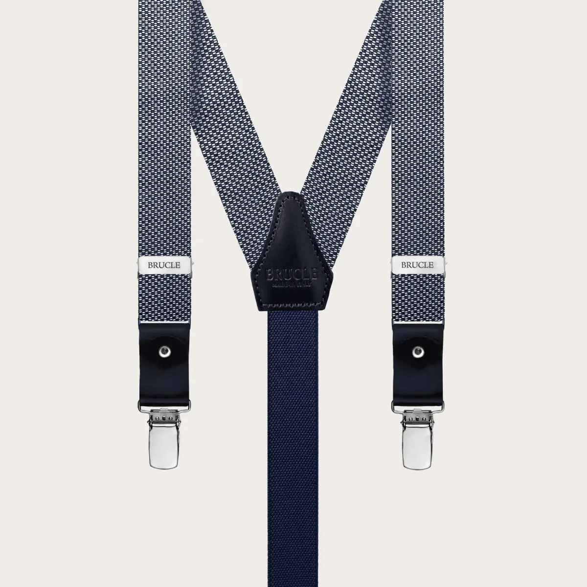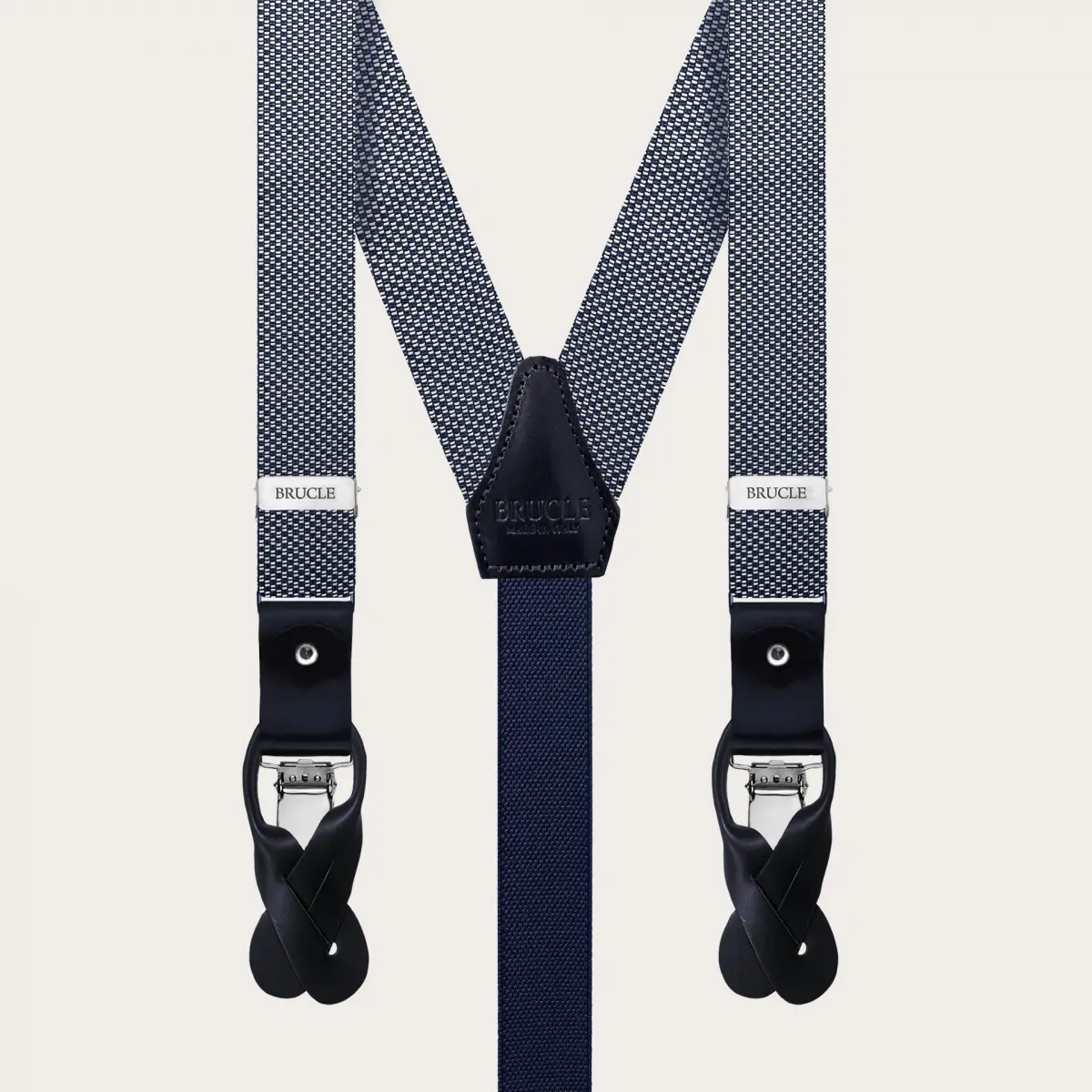 Bretelle uomo sottili in seta blu con micro motivo bianco. Un modello versatile e di tendenza, con un design di facile abbinamento, in grado di conferire luminosità al tuo outfit. Grazie al sistema doppio uso queste bretelle eleganti si possono indossare con i bottoni o con le clip, a seconda delle occasioni.