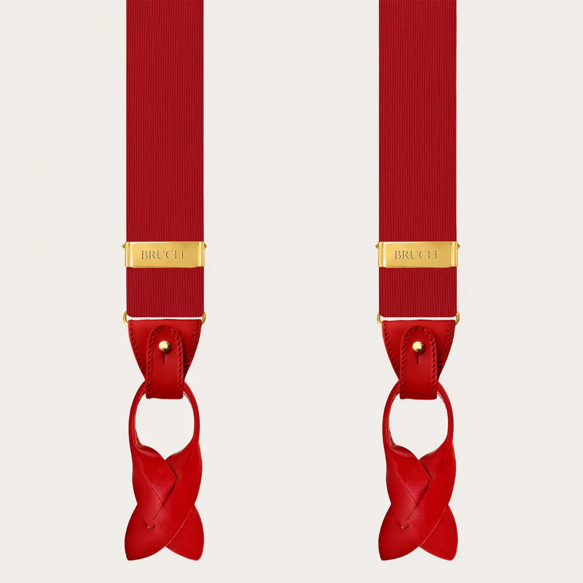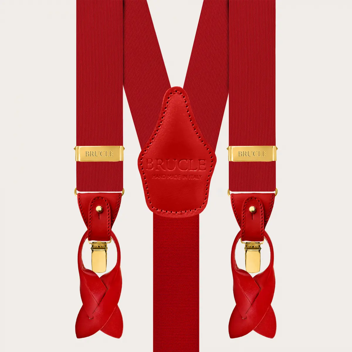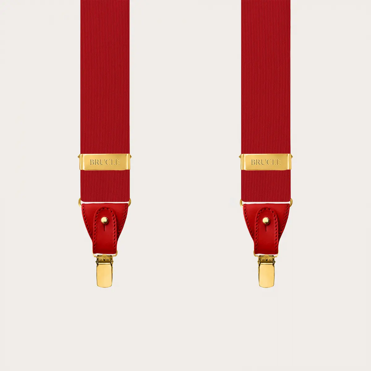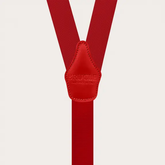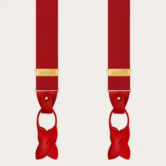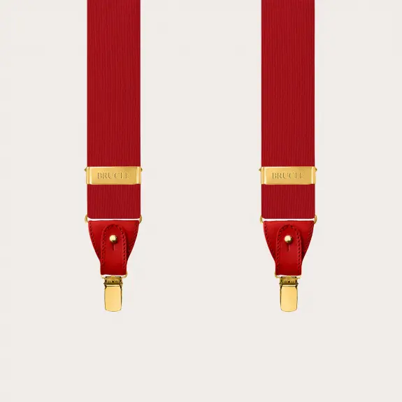 Eleganti bretelle in seta rosse con clip oro, perfette per elevare qualsiasi look con un tocco di colore audace. Realizzate interamente a mano in Italia, queste bretelle offrono versatilità, essendo indossabili sia con i bottoni sia con le clip, e si adattano magnificamente a ogni tipo di evento, in particolare quelli formali.