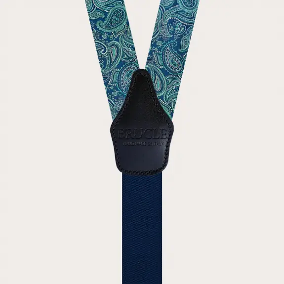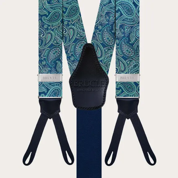 Bretelle eleganti per uomo in seta con fantasia paisley nei toni del verde: un modello dal design senza tempo, con una seta jaquard ricca e preziosa che valorizza il pattern paisley. Interamente fatte a mano in Italia, queste bretelle per bottoni sono curate in ogni minimo dettaglio, per darti un'esperienza superiore. Scopri anche la cravatta e il papillon coordinato, per un look unico e raffinato. Anche queste bretelle sono personalizzabili con incisioni sui davantini in pelle, per essere ancora più uniche.