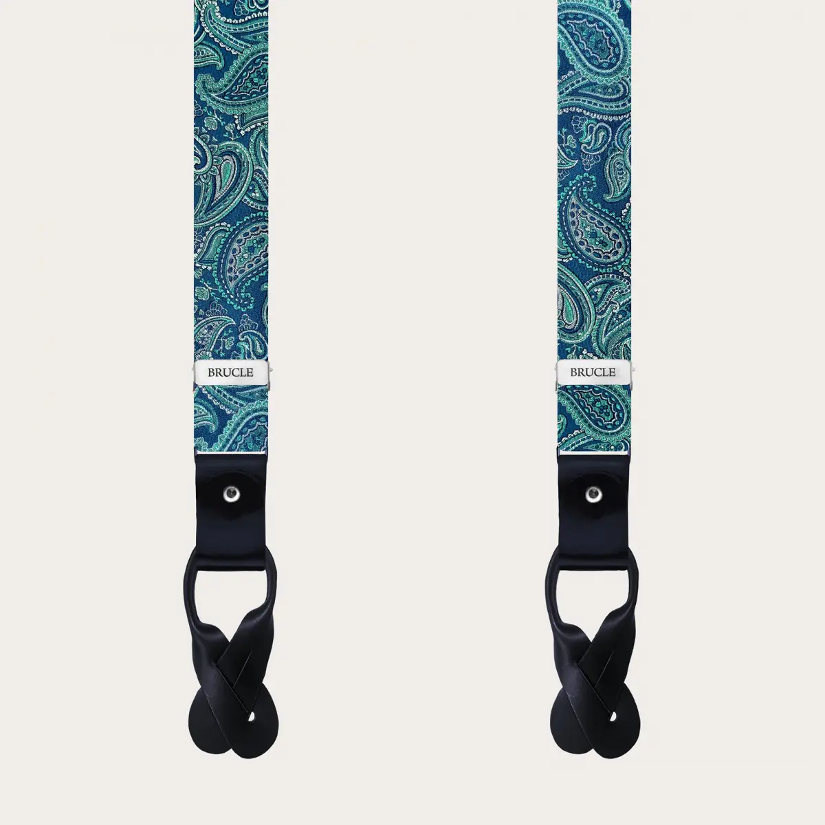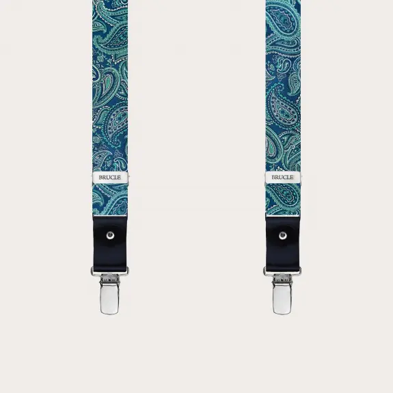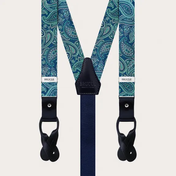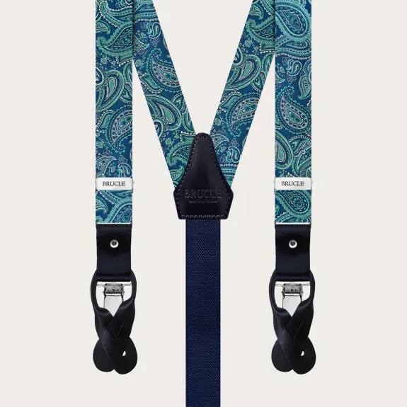 Bretelle da uomo in seta paisley verde strette, interamente fatte a mano in Italia. L'esclusivo motivo paisley nei toni del verde, è molto versatile e si abbina perfettamente alle cerimonie ma anche a uno stile ricercato e casual. Anche queste bretelle sono personalizzabili con incisioni su clip o terminali in pelle, per un'esclusività totale. Queste bretelle si possono indossare con i bottoni o con le clip e rappresentano l'artigianalità italiana e la massima cura per i dettagli.