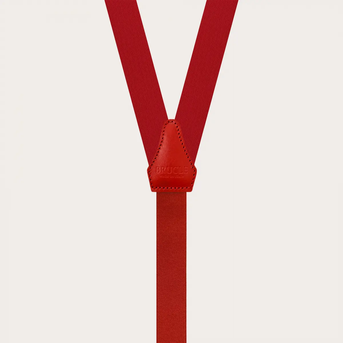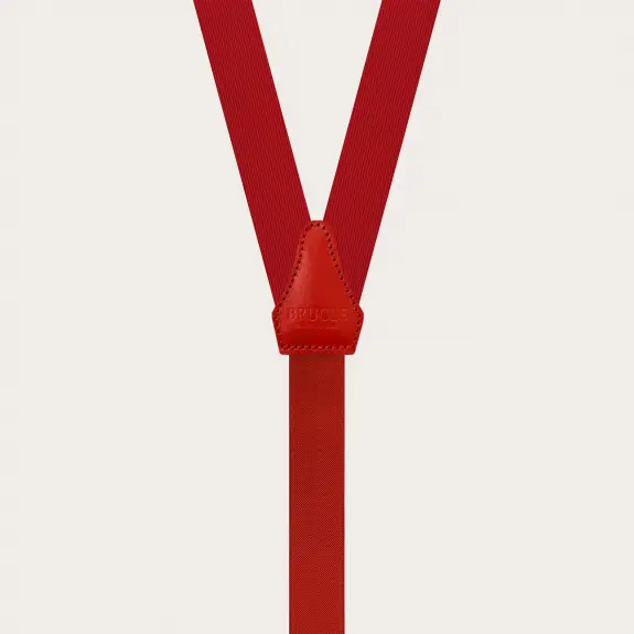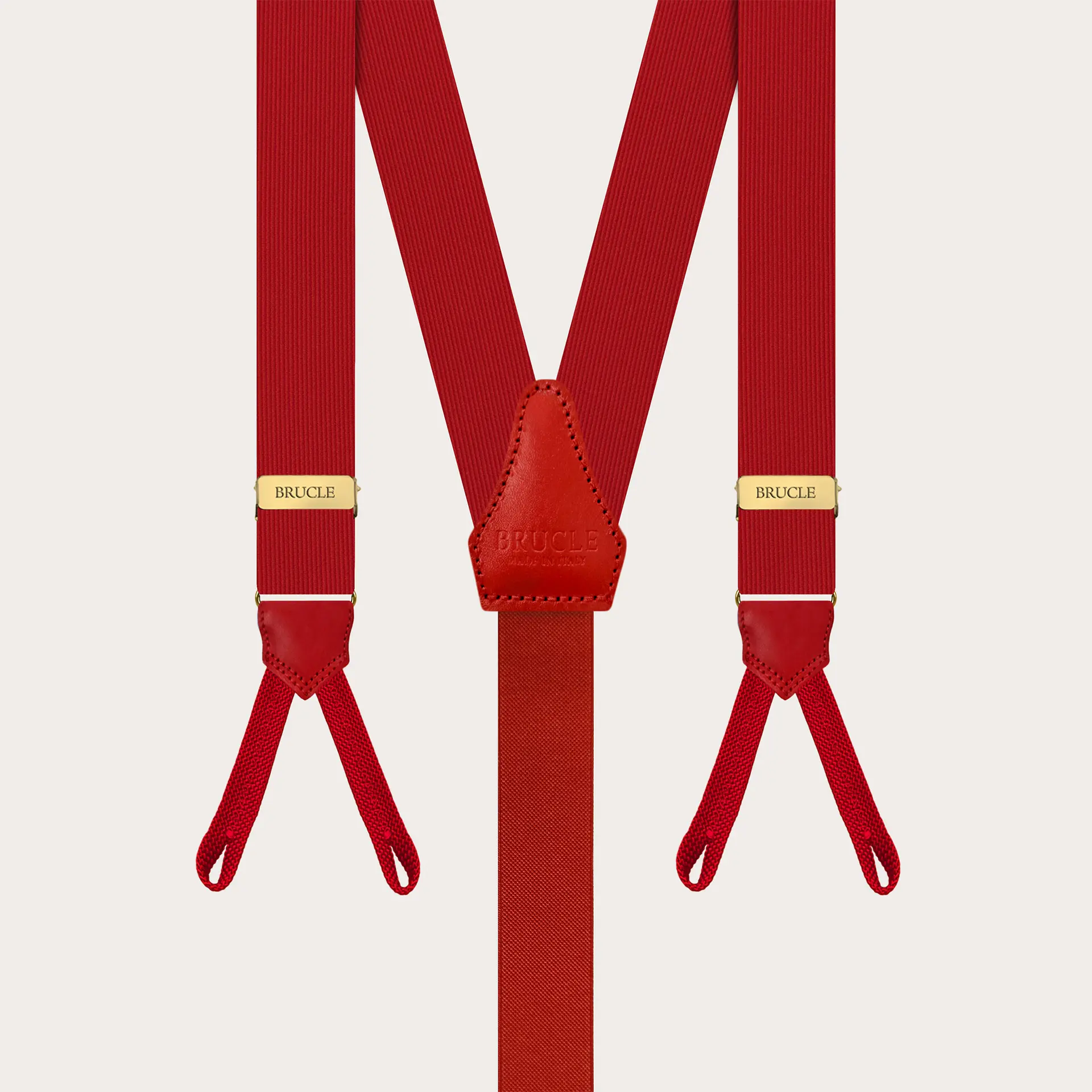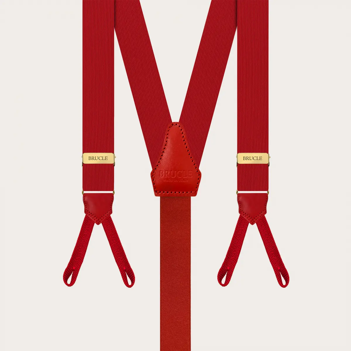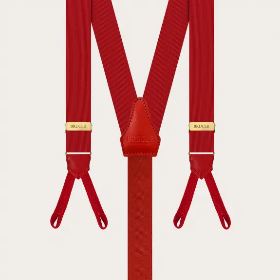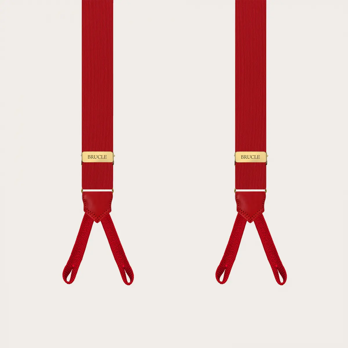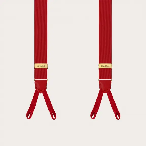 Bretelle rosse strette per bottoni in pura seta con parti metalliche oro, fatte a mano in Italia.