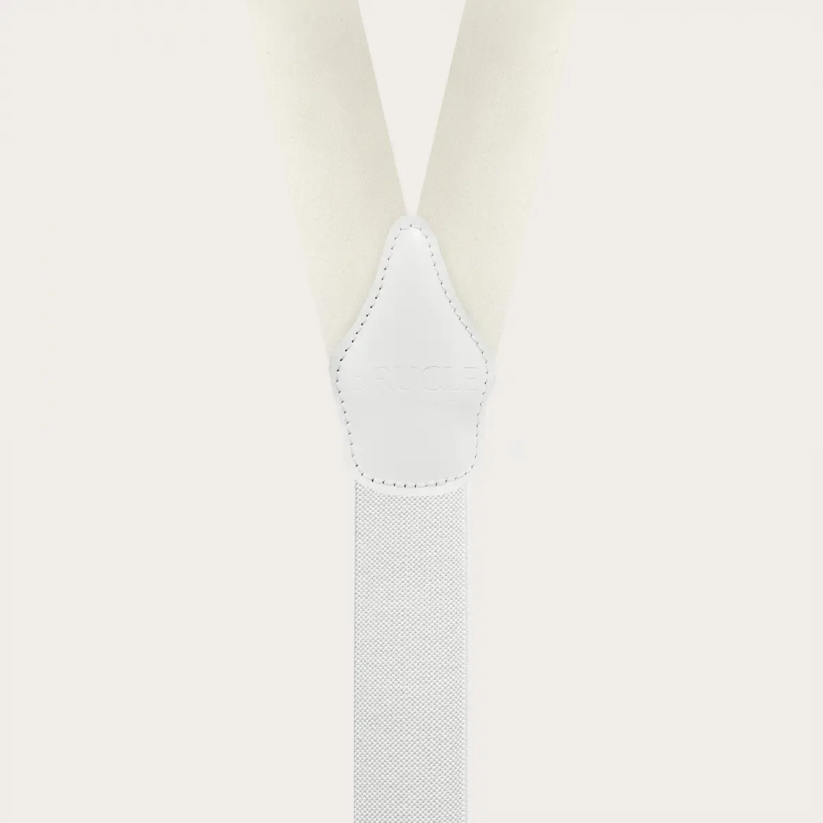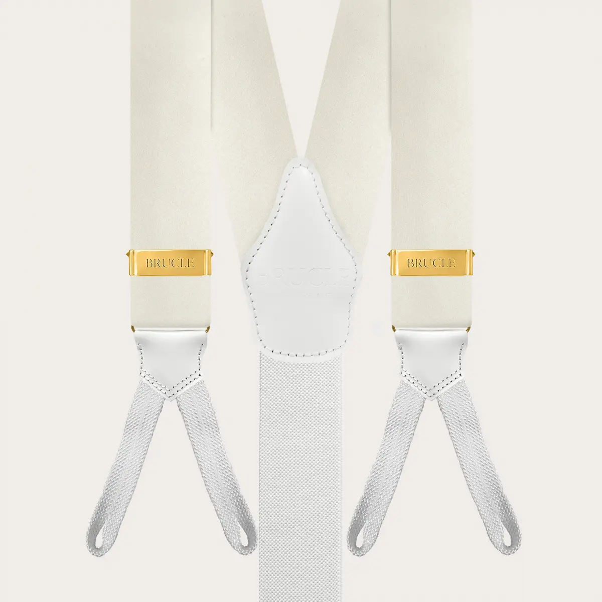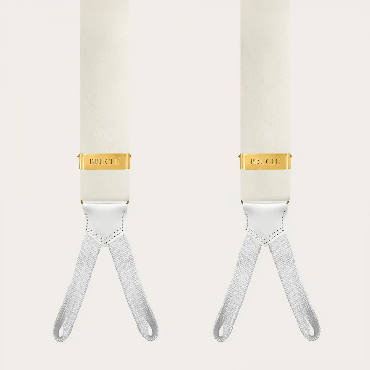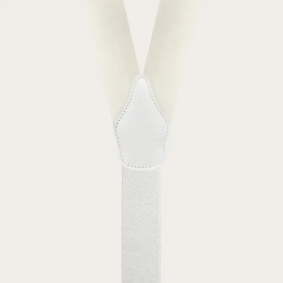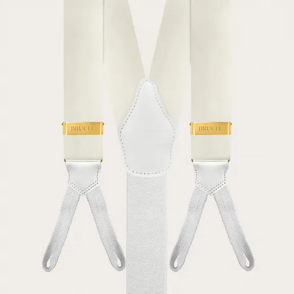 Bretelle cerimonia in raso di seta bianco con asole per bottoni, impreziosite da parti metalliche oro che conferiscono a queste bretelle artigianali un aspetto lussuoso e prezioso.