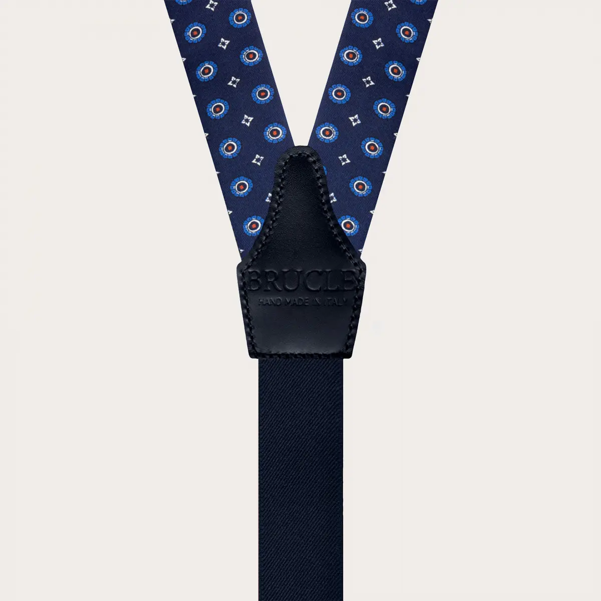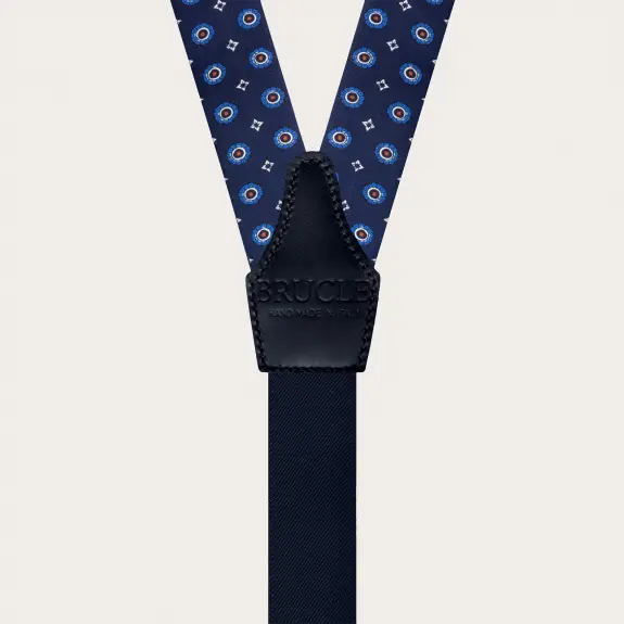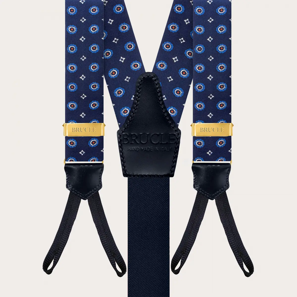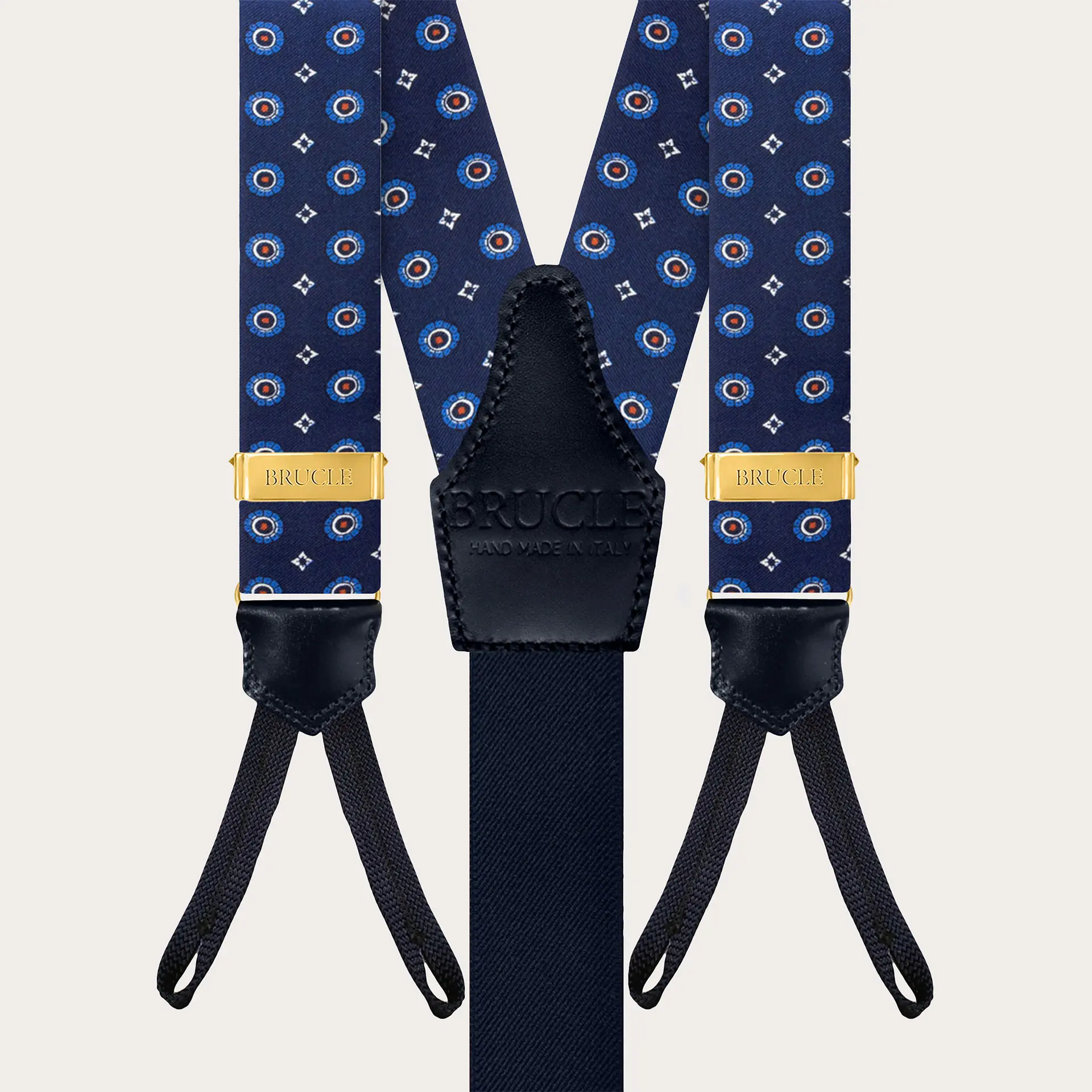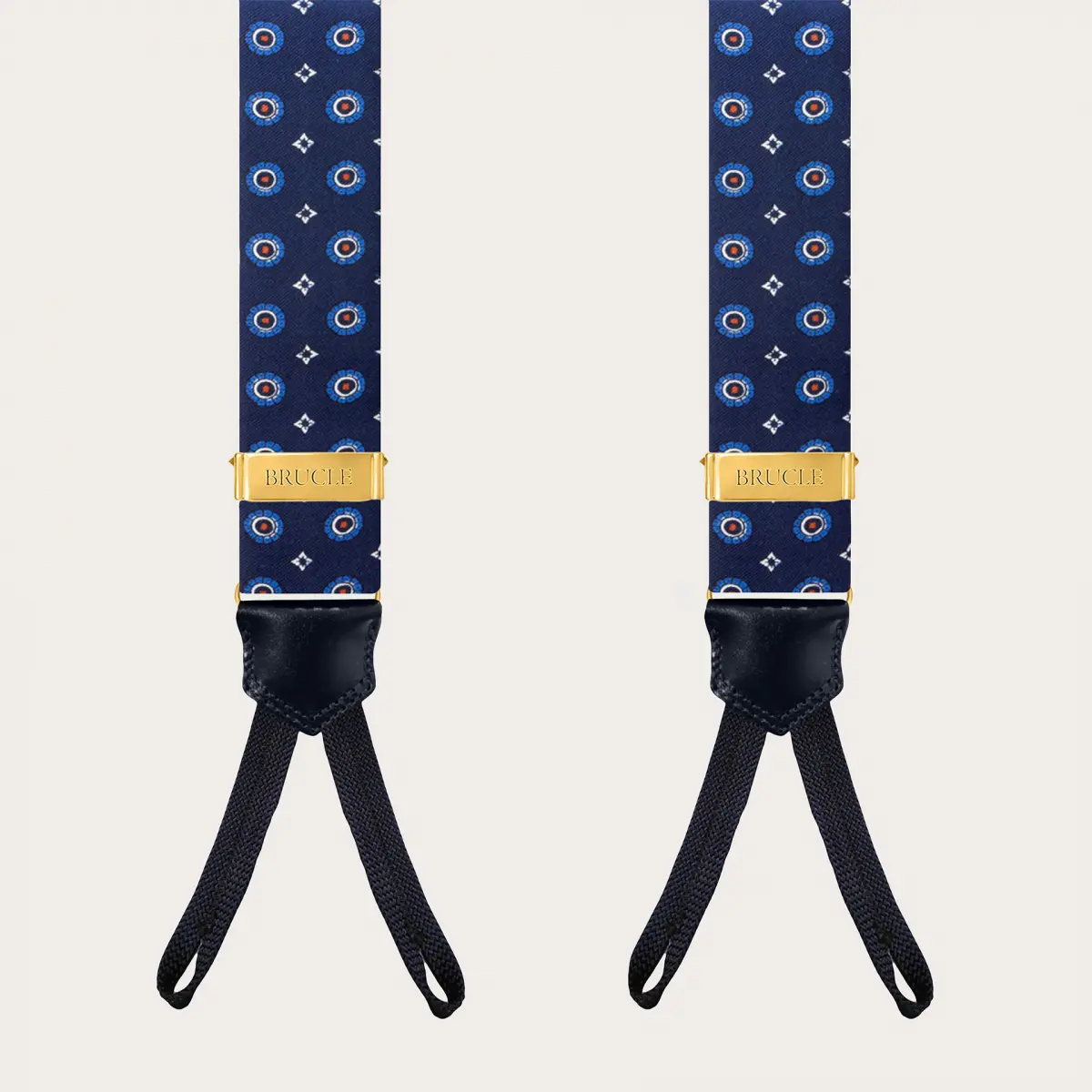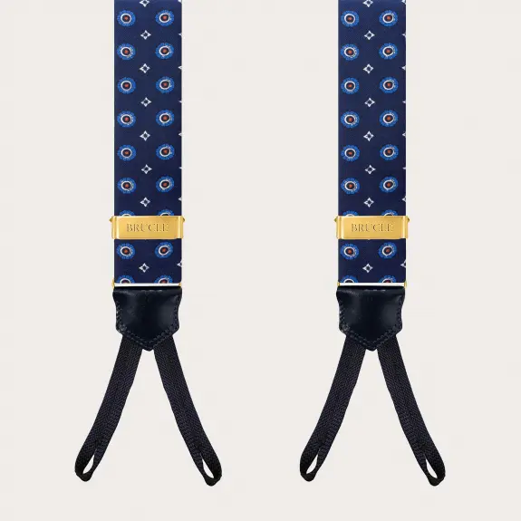 Bretelle in seta blu a fiori con asole e parti metalliche oro