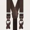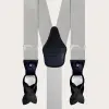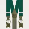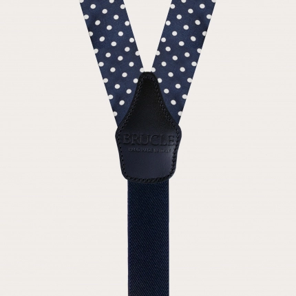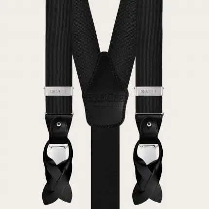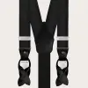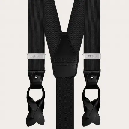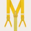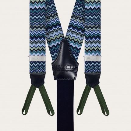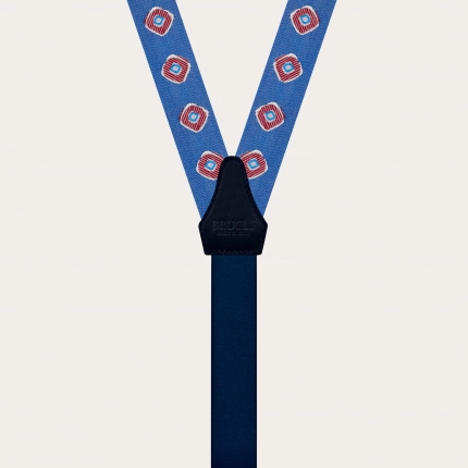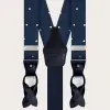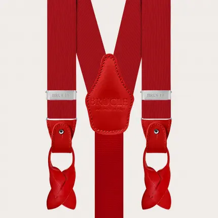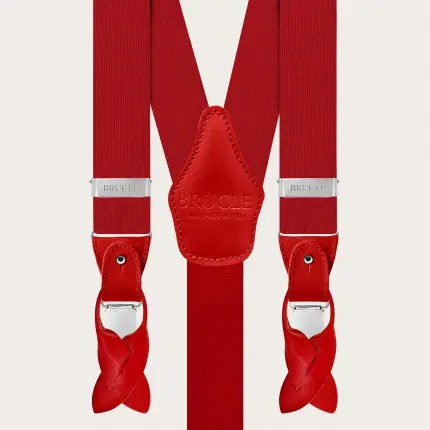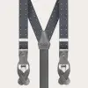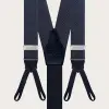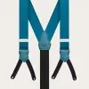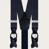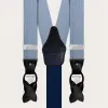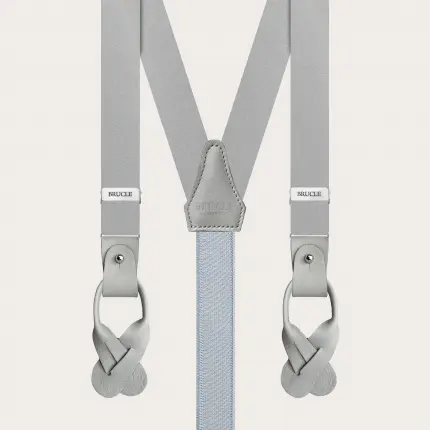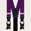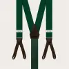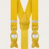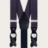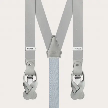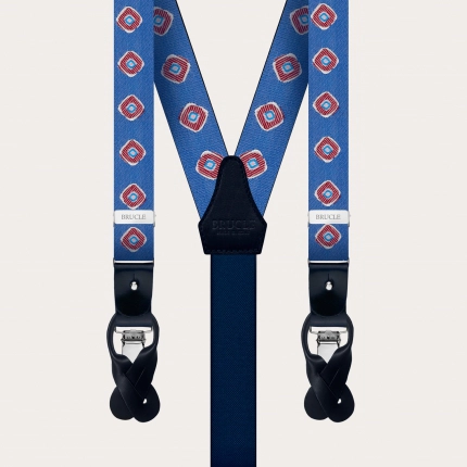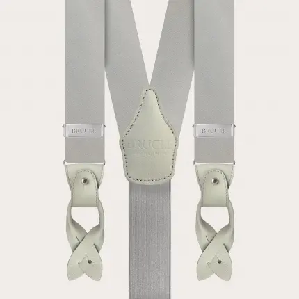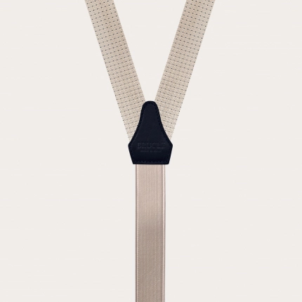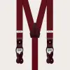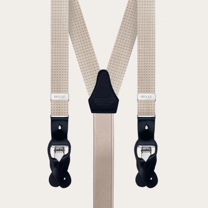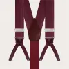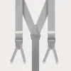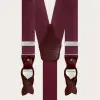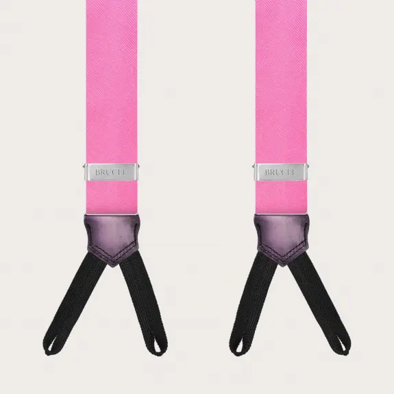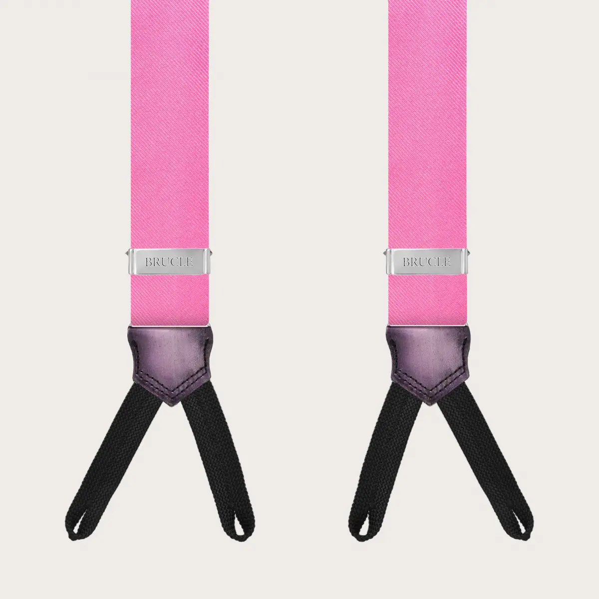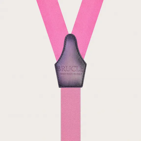 Scopri le eleganti bretelle rosa con asole per bottoni in seta jacquard, impreziosite da dettagli in pelle sfumata a mano.