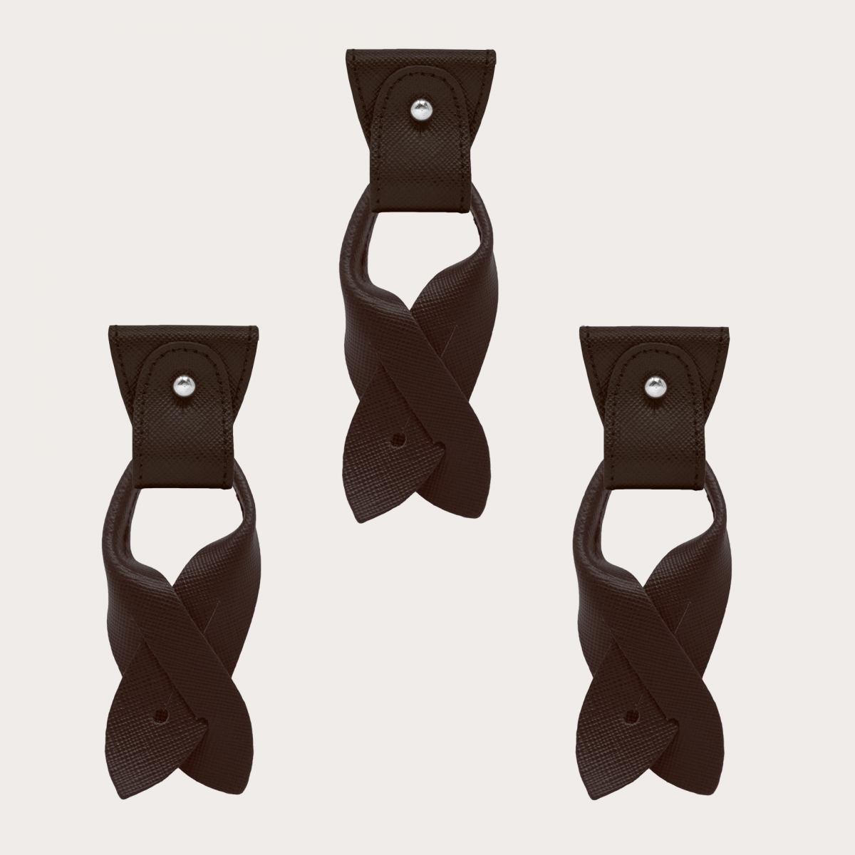 Set di terminali e baffi in vera pelle bovina stampa saffiano testa moro, per bretelle doppio uso convertibili con clip e bottoni. Una pelle impreziosita da una stampa raffinata ed elegante per accessori pensati per chi vuole cambiare aspetto alle proprie bretelle creando abbinamenti unici.