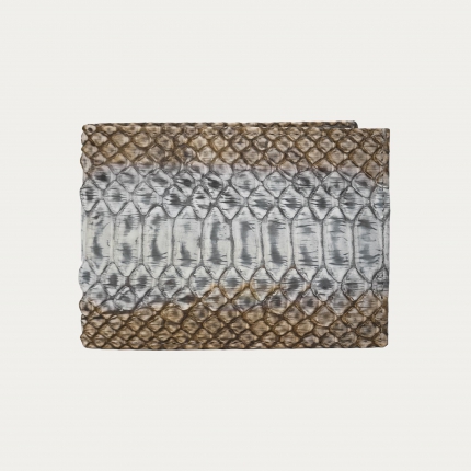 Scopri il fascino sofisticato del portafoglio verticale in vero pitone BRUCLE, nella raffinata tonalità dusty blue: un grigio elegante con sfumature azzurre che mettono in risalto la texture naturale della pelle di pitone reticolato. Realizzato interamente a mano in Italia con pellami esotici certificati CITES, è rifinito con un interno in morbida pelle bovina e resistente fodera in poliestere, per garantire funzionalità e durata nel tempo.